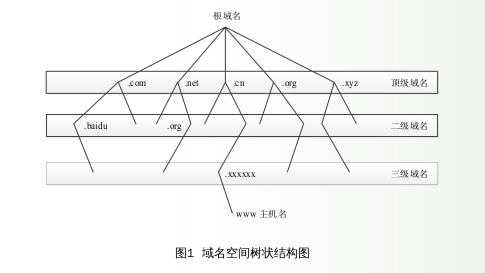 域名系统能实现域名与IP地址的快速映射与转换,为了保证网络中域名的唯一性,域名系统采用特殊的树状结构以实现域名层次的划分,每一个树形节点都有不同的子节点,每一个域名都是从当前节点读到根节点路径上所有节点标记的点分顺序连接的字符串,如图1对应的域名为“www.xxxxxx.org.cn.”。其中,最后的“.”(通常省略)为根域名,“.cn”为顶级域名,“.org”为二级域名,“.xxxxxx”为三级域名,“www”为主机名。上级域名服务器中维护着其名下所有次级域名的信息,如根域名服务器中维护所有顶级域名的域名和地址信息。